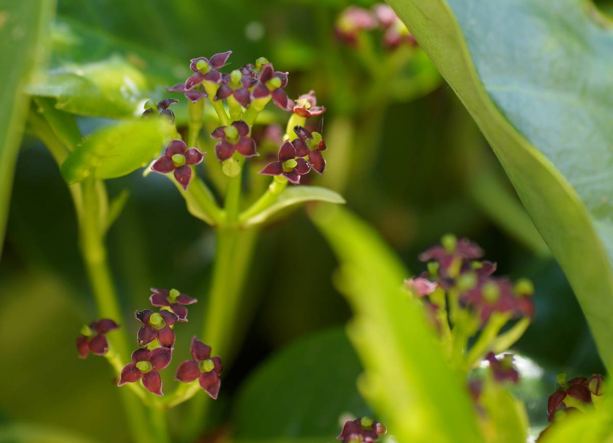 لا تزهر أوكوبا أبدًا في المنزل. في حالات نادرة ، تظهر زهور حمراء غير موصوفة في شهر يونيو. يتم جمعها في النورات الصغيرة. ثم يعطون التوت الأحمر الكبير غير الصالح للأكل.