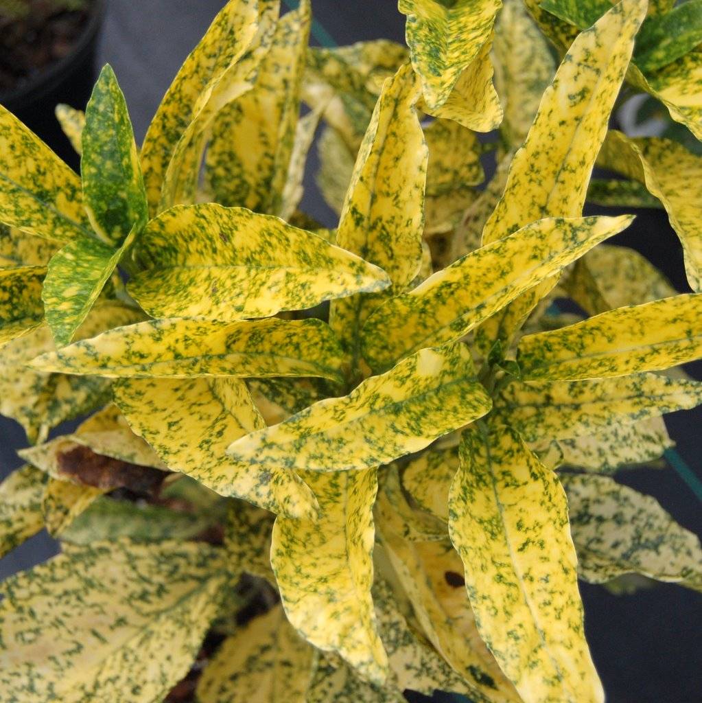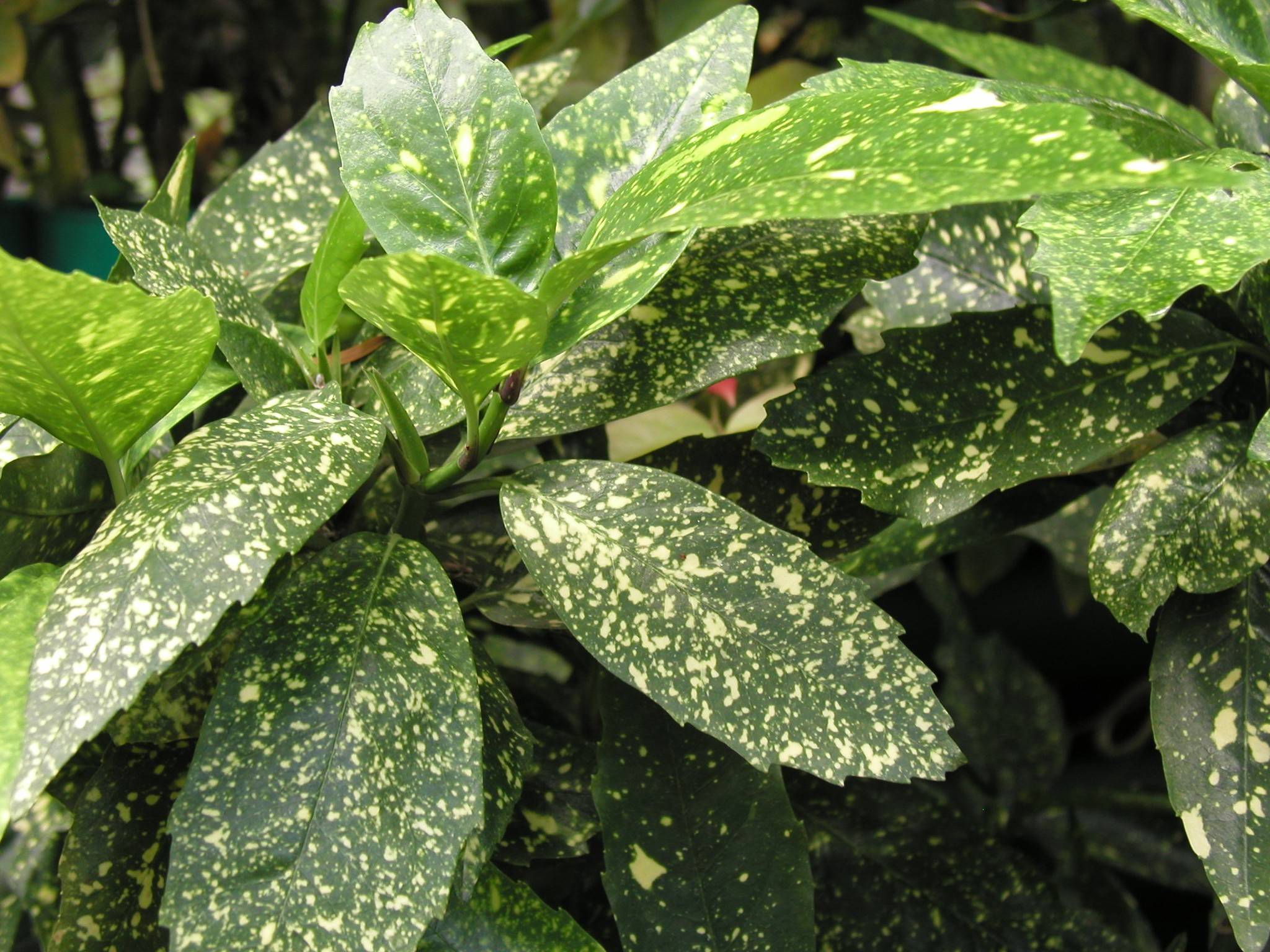 - Aucuba Crotonifolia هي شجيرة طويلة يصل عرضها إلى 3 أمتار. تنمو الأوراق حتى 20 سم ، ونقاط ذات أشكال مختلفة ، ويمكن أن تندمج في أنماط صغيرة.