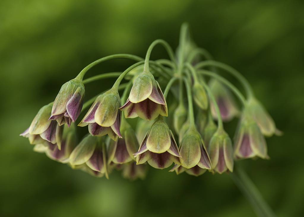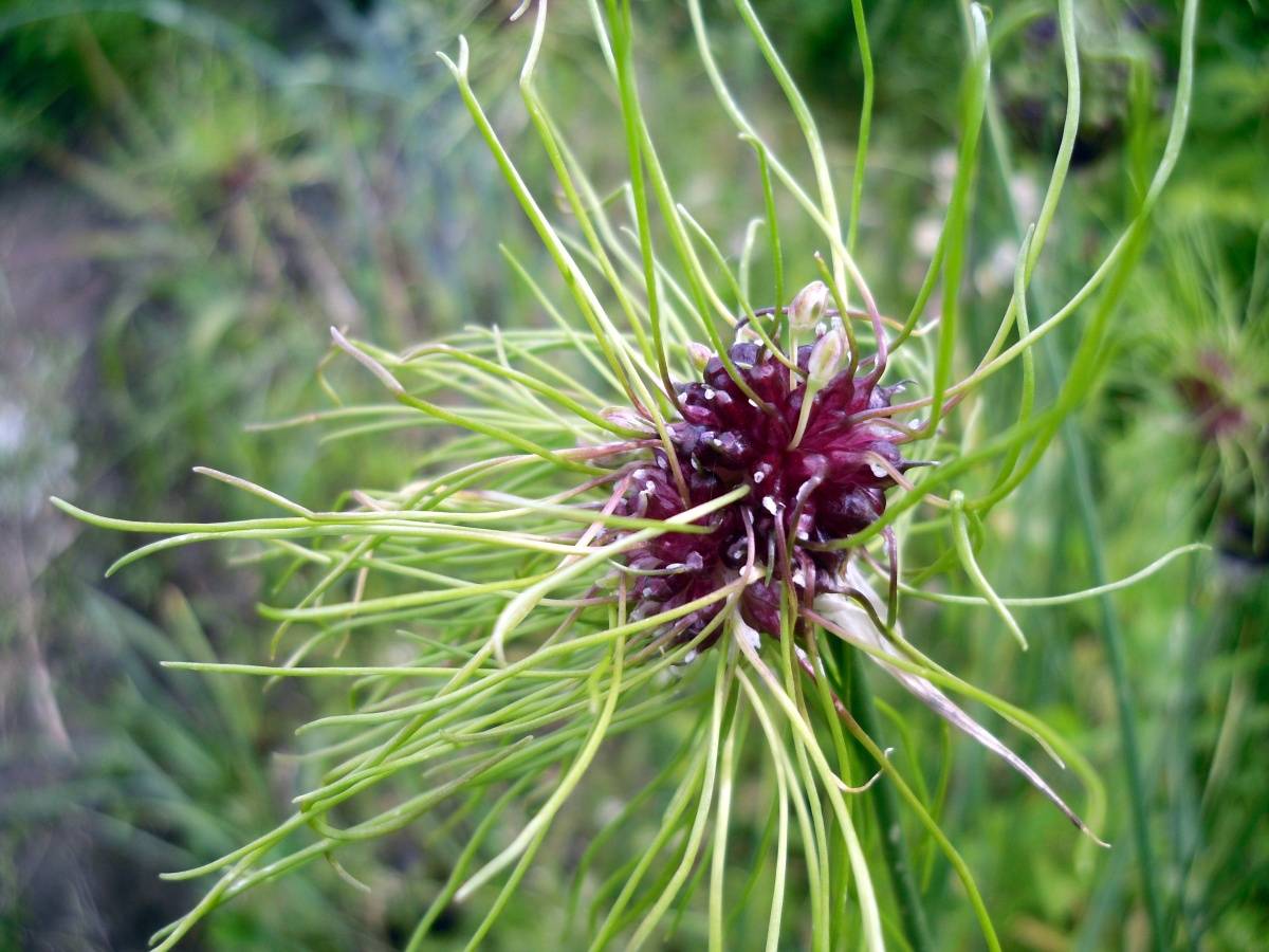 Im Frühjahr, wenn das bulgarische Allium aufwacht, erscheinen zuerst die dünnen langen Stängel, die sich nach oben erstrecken. An ihren Enden befinden sich Spitzen aus grünen Blättern, die zu einer Spirale verdreht sind, die dünner als Papier ist. Zu diesem Zeitpunkt sind die Spitzen wie Chilischoten geformt. Allmählich öffnet sich diese Rolle und 20-30 Knospen an dünnen Beinen öffnen sich. Der Regenschirm ist insgesamt etwa so groß wie ein Tennisball. Aus den Knospen blühen burgunderrote oder rosa Glocken mit schneeweißem Rand.