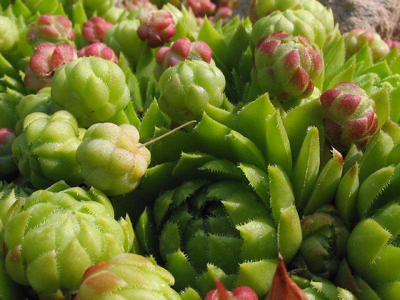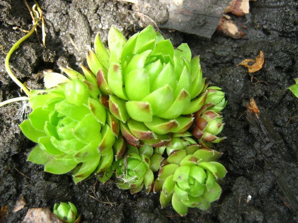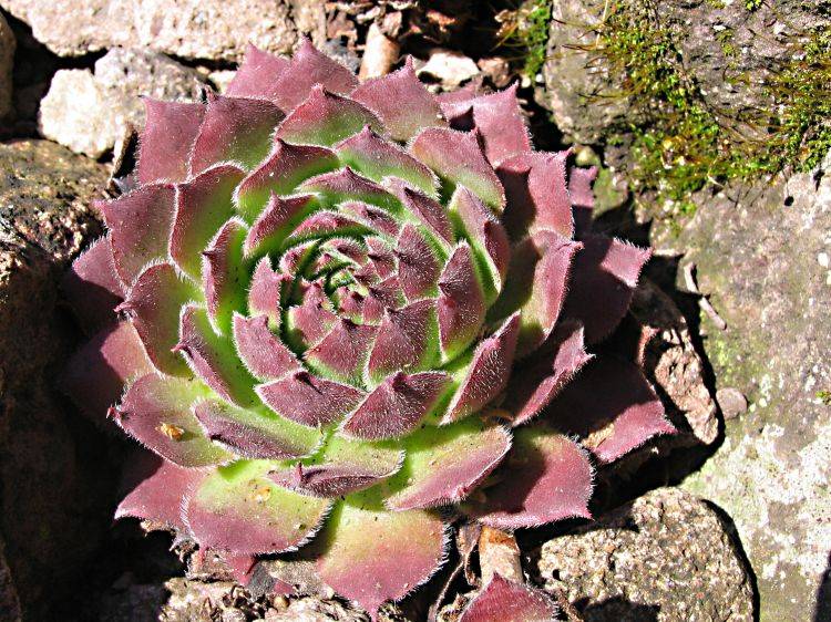 Seit der Antike wird es zum Pflanzen auf Dächern aus Ton und Stroh verwendet.Es wurde angenommen, dass dies ein Weg ist, das Haus vor Blitzeinschlägen zu schützen. Die Rosetten sind normalerweise 5 cm breit, können aber einen Durchmesser von bis zu 20 cm erreichen. Die Blätter sind dunkelgrün bikonvex, die Ränder können rot, gelb, braun gefärbt sein. Im Blütenstand 40 bis 100 Blüten von rosa oder lila Farbe.