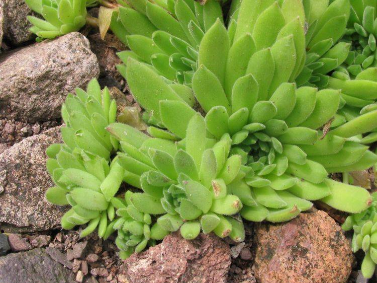 Diese Art wird manchmal separat als Steinkulturen bezeichnet. Krautige Staude, die zahlreiche Basalrosetten mit einem Durchmesser von 3 bis 8 cm bildet. Die grünen Blätter haben rötliche Ränder mit weißen Zilien. Aus den Blattachseln wachsen während der Saison bis zu 10-15 anfangs rötliche Triebe mit kugelförmigen Rosetten, die beim Herunterfallen leicht in der Nähe wurzeln.