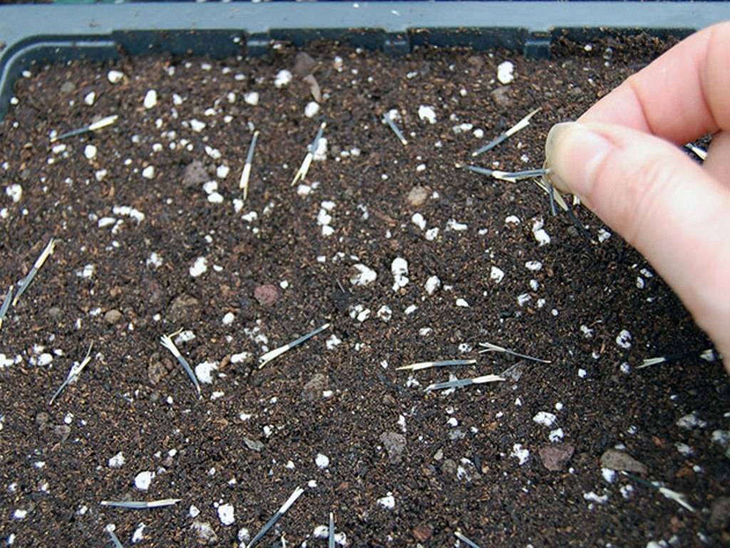 Die Samen können nun in den zuvor vorbereiteten Boden gesät werden. Die Tiefe der Furche beträgt ca. 2 cm, in einem Abstand von ca. 2 cm. Um den Vorgang zu beschleunigen, kann der Behälter oben mit Polyethylenfasern abgedeckt werden, um einen Treibhauseffekt zu erzielen. Der Boden sollte immer feucht bleiben. Regelmäßige Belüftung verhindert die Entwicklung von Pilzkrankheiten.