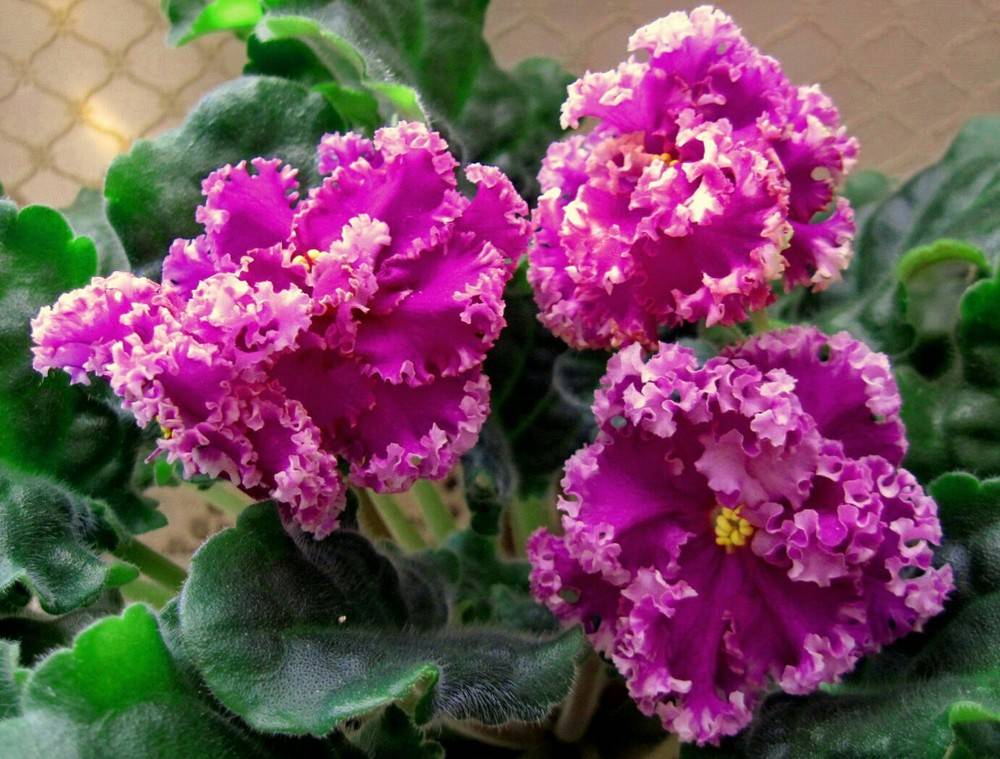 Saintpaulia blüht wunderschön und lange. Während dieser Zeit ist der gesamte Busch mit purpurroten Blütenständen bedeckt. Die violette Rosette besteht aus großen samtig grünen Blättern. Mit zunehmendem Alter können die Ränder der Blattplatten eine leichte Welligkeit annehmen. Schöne Blütenstände wachsen aus der Mitte des Auslasses.
