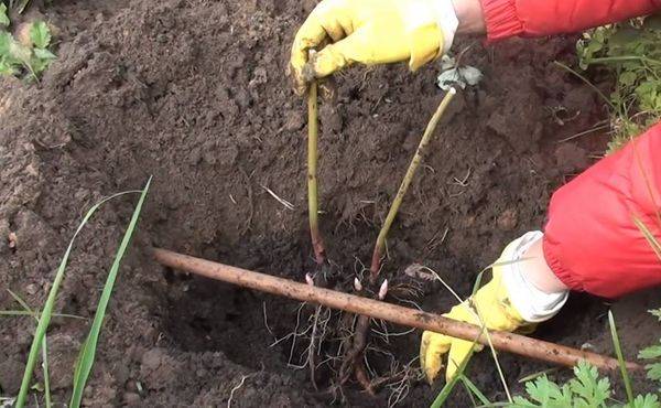 - Vertiefen Sie den Sämling so, dass sich die Knospen in einer Tiefe von 5 cm im Boden befinden.