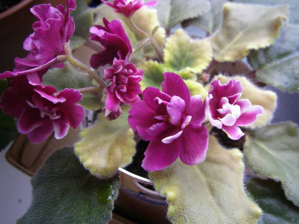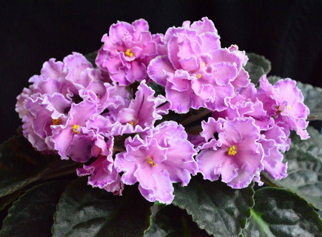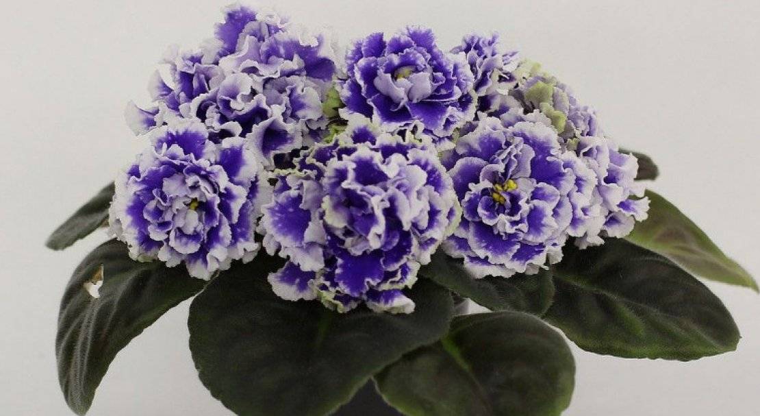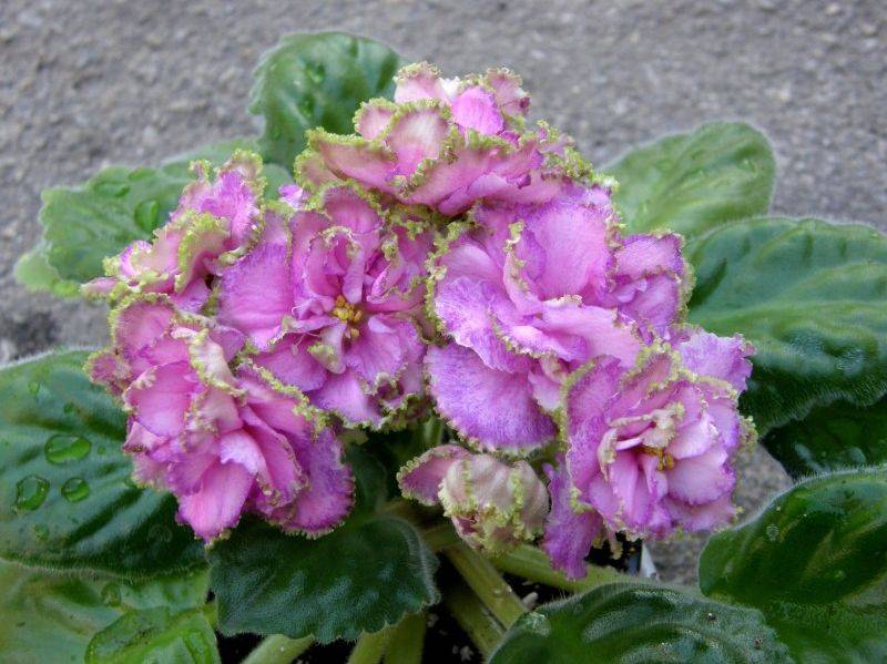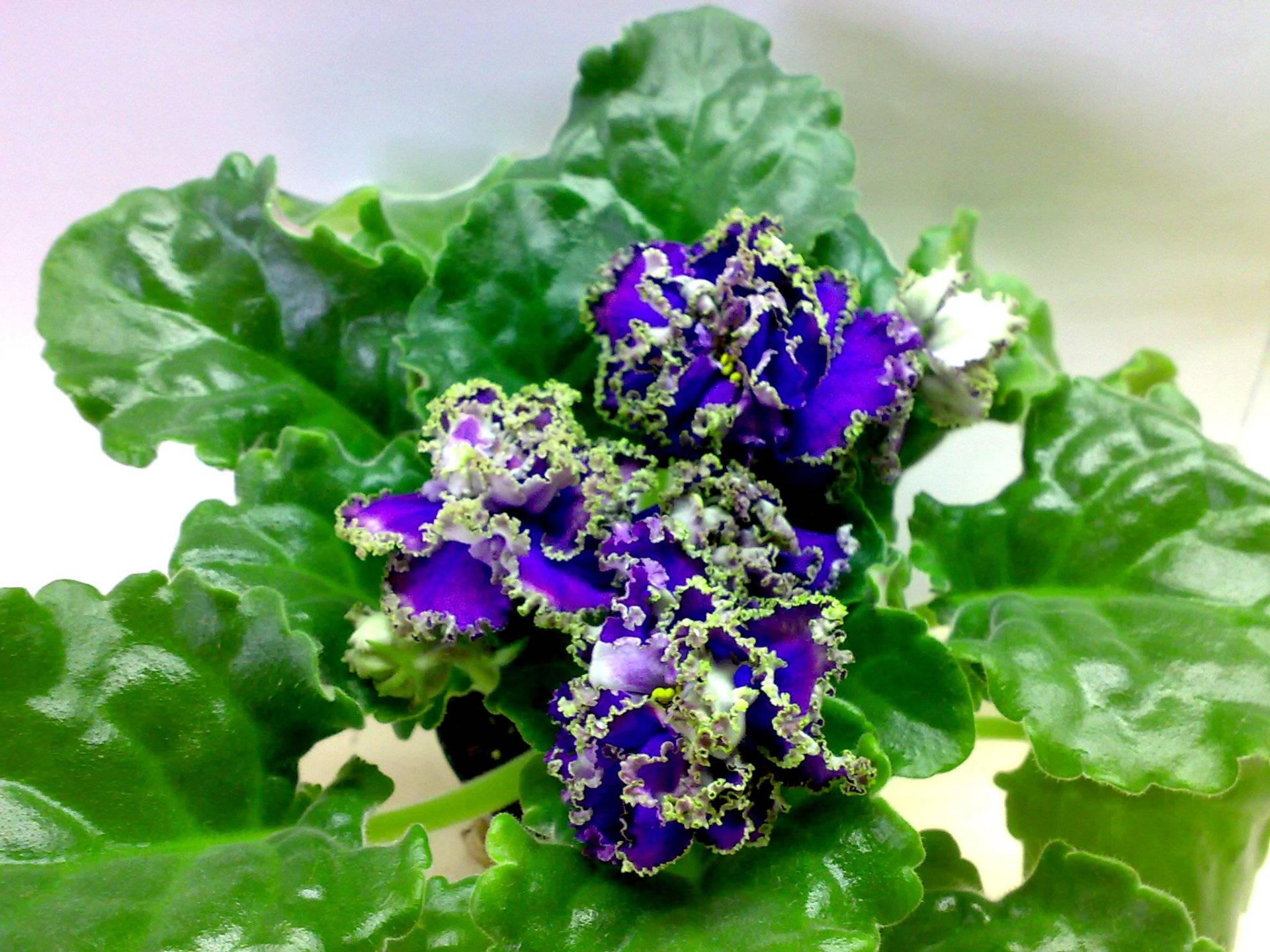 Тази лилава теменужка с обемна зелена граница е много капризна за отглеждане. Ако не се полива правилно, може да умре. Цветята и листата имат причудливи извити форми. Пъпките са разположени на мощни дръжки от 3 или 5 парчета. Когато цъфтят, те могат да достигнат 5 см в диаметър.
