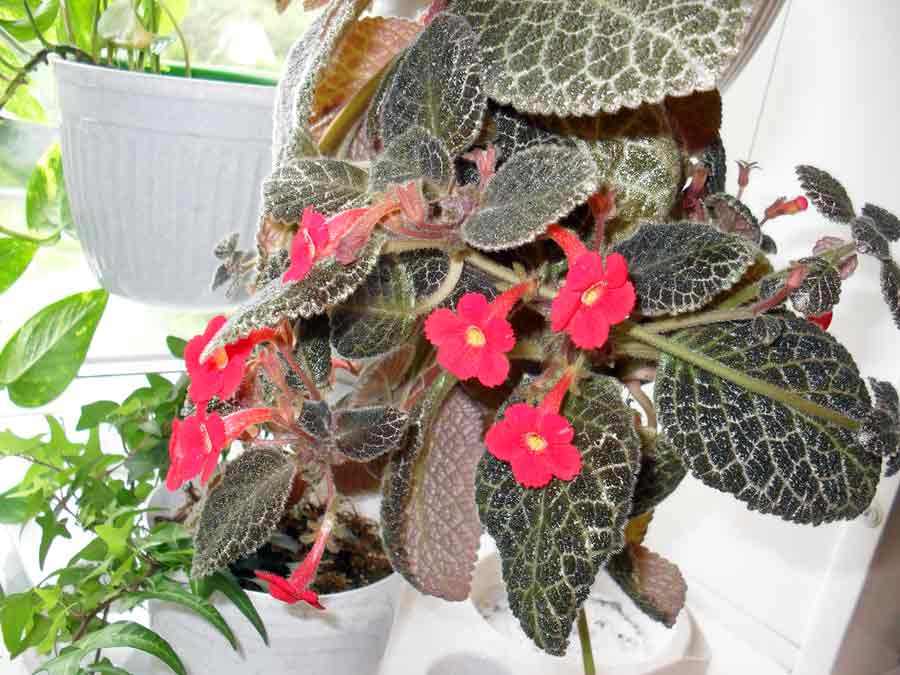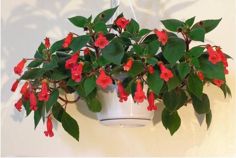 Домашното червено цвете на Колуми се отглежда във висящи саксии като ампелно растение.
