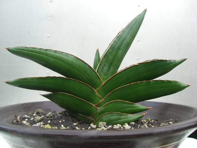 - Sansevieria Bonselensis е собственик на обемни цилиндрични листни плочи, подредени по ветрило. Цветът е зелен, цилиндрите са покрити с леко восъчно покритие, а стандартните тъмни ивици преминават през;