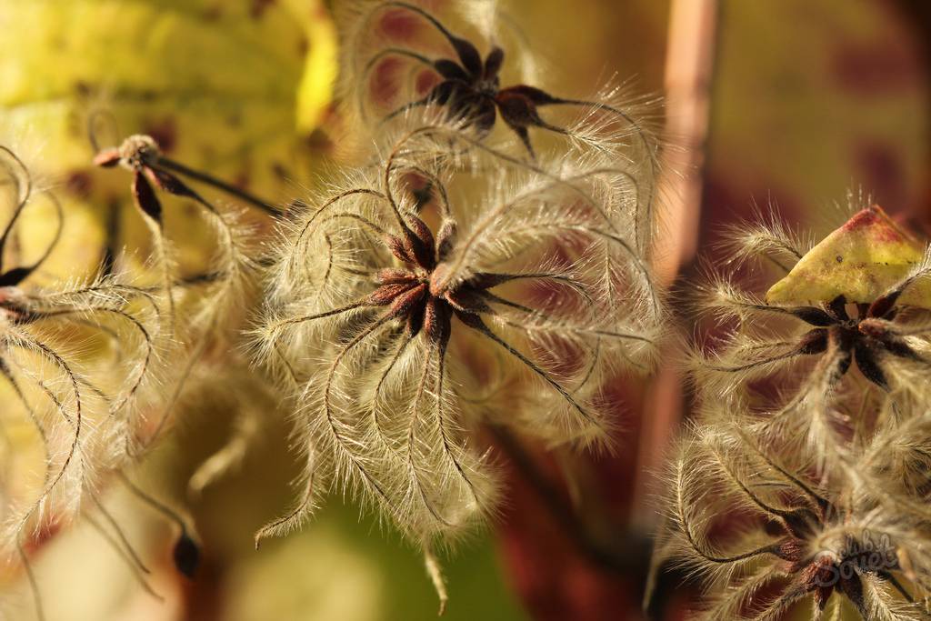 Включва бял дребноцветен храст клематис Изгаряне с много малки бели цветя, както и Есен и Trizhdytroichesky клематис.