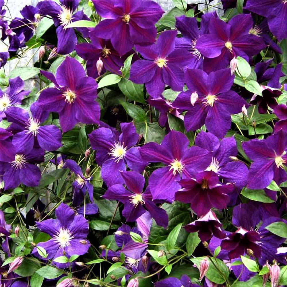 - Виолетова клематис (Clematis viticella), включително лозя с дървесни и къдрави стъбла. Цветята могат да бъдат прости и двойни, чинийка или камбана. Този голям раздел включва хибриди Jacquemann и Durand, вълнени и лилави клематиси и други.