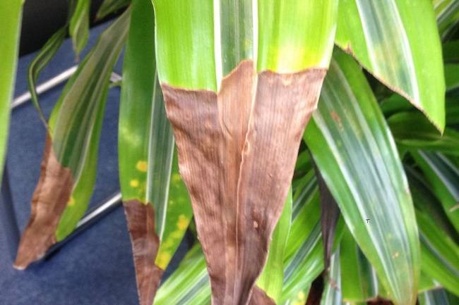Εάν συμβεί αυτό, τότε είναι επείγουσα ανάγκη αναθεώρησης του προγράμματος άρδευσης. Το Dracaena δεν έχει αρκετό νερό, έτσι τα φύλλα (σε πιο σοβαρές περιπτώσεις και το στέλεχος) στεγνώνουν και γίνονται κίτρινα. Αυξήστε την ποσότητα νερού για άρδευση.
