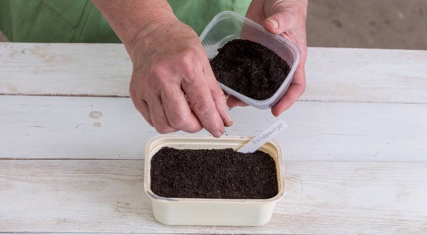 Η ικανότητα φύτευσης μπορεί να είναι οποιαδήποτε. Το κύριο πράγμα είναι ότι είναι ευρύχωρο και επεξεργάζεται πριν από τη σπορά. Τα δοχεία πρέπει να ξεπλυθούν με διάλυμα υπερμαγγανικού καλίου για απολύμανση. Οι σπόροι μπορούν να φυτευτούν σε πλαστικά ή ξύλινα κουτιά.