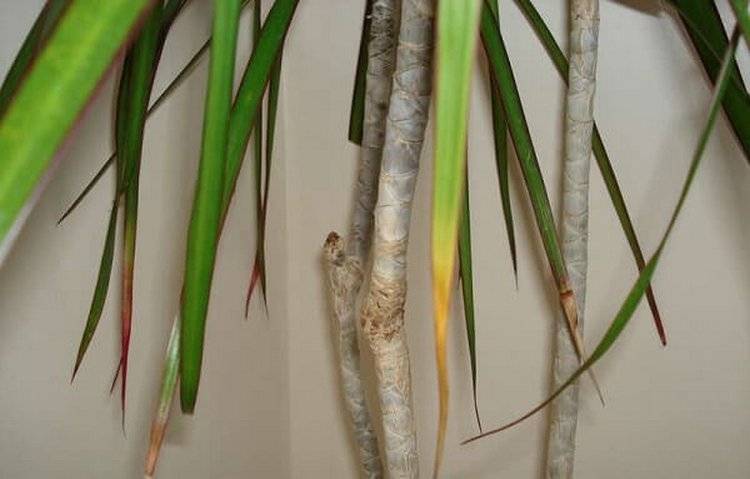 Παρατηρείται αποσύνθεση του ριζικού συστήματος dracaena με υπερβολικό πότισμα. Η διαδικασία αποσύνθεσης ξεκινά από τις ρίζες, σταδιακά επηρεάζει τον κορμό και τα φύλλα. Ως αποτέλεσμα, το φυτό πεθαίνει.