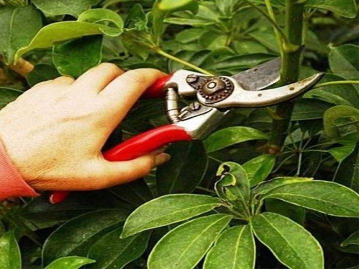 Η Sheflera μεγαλώνει πολύ γρήγορα, οπότε χρειάζεται τακτικό κλάδεμα. Εάν δεν γίνει, το φυτό θα αυξηθεί μέχρι το ανώτατο όριο. Αυτή η διαδικασία όχι μόνο δίνει το φυτό, αλλά και προστατεύει από τα παράσιτα.