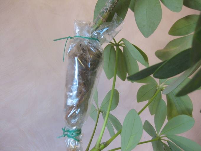 Στη συνέχεια, ο βλαστός συνδέεται με ένα ραβδί, το οποίο τοποθετείται σε μια γλάστρα σε ένα λουλούδι. Ποτίστε το φυτό μέσω της άνω τρύπας. Μετά από 21 ημέρες, οι πρώτες ρίζες εμφανίζονται στον μελλοντικό θάμνο. Η ταινία αφαιρείται προσεκτικά. Το βλαστάρι πρέπει να κοπεί υπό γωνία και να φυτευτεί σε νέα θέση.