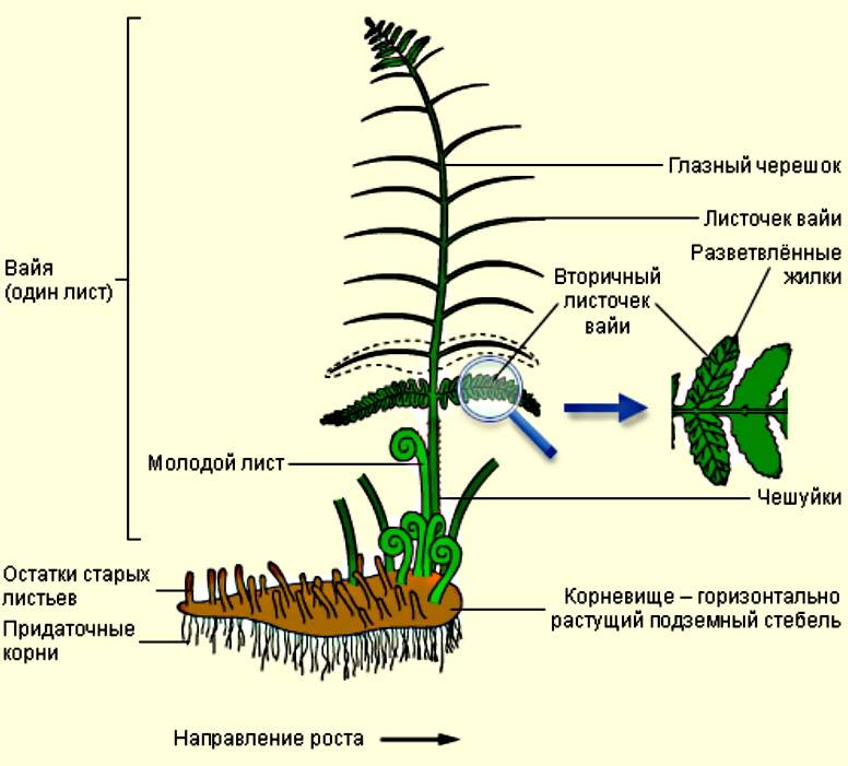 Μαζί με το συνηθισμένο ρίζωμα φυτικών οργάνων στις φτέρες (Polypodióphyta), αντί για μίσχους, φύλλα, μίσχους με λοβό σπόρου, αναπτύχθηκε ένας βλαστός που μοιάζει με φύλλα, ο οποίος έλαβε το επιστημονικό όνομα frond. Τα σπόρια σχηματίζονται στα φύλλα, με τη βοήθεια των οποίων εμφανίζεται ένας από τους τρόπους αναπαραγωγής και ανάπτυξης φτερών.