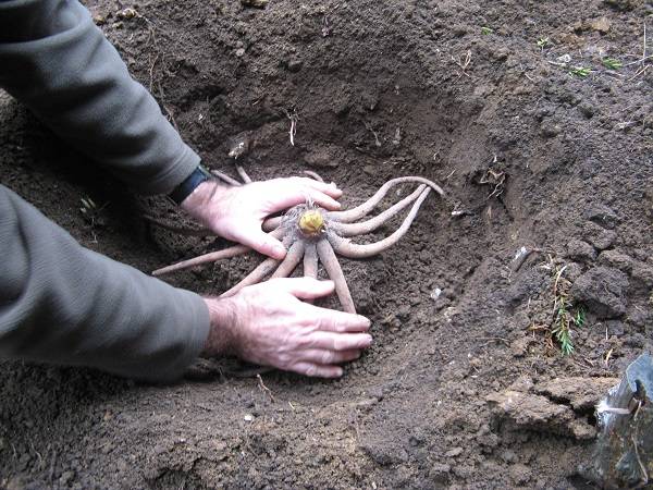 - Το ριζικό σύστημα ισιώνεται προσεκτικά, τα κενά καλύπτονται με γη και συμπιέζονται.
