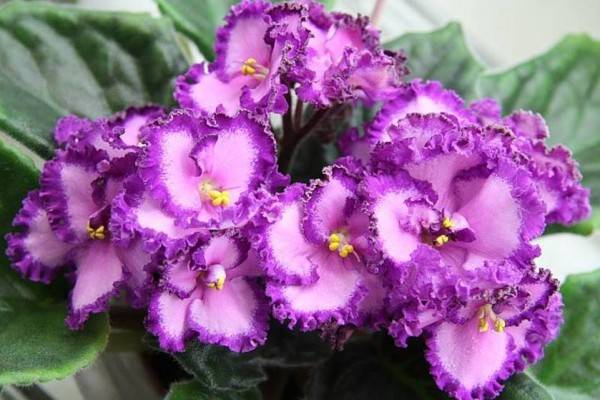 Στις βιολέτες, οι άκρες των πετάλων δεν έχουν διαιρέσεις, τα διπλά άνθη έχουν διάμετρο 5-7 cm. Υπό ευνοϊκές συνθήκες, υπάρχουν δείγματα έως 8 cm.