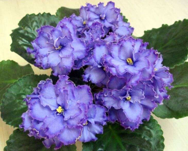 Η περιγραφή δείχνει ότι τα άνθη μεγαλώνουν σε διάμετρο περίπου 7 εκ. Έχουν έντονο μπλε χρώμα με σκαλιστό περίγραμμα. Σε ένα δροσερό δωμάτιο, τα πέταλα γίνονται φωτεινά μοβ. Ένας μίσχος έχει 4-5 μπουμπούκια.