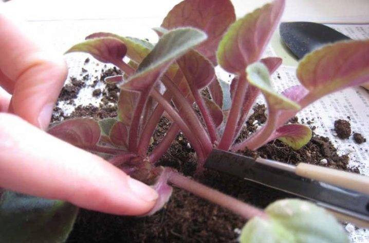 Ένας ενήλικας Saintpaulia αυξάνει τις κόκκινες ροζέτες. Ένα φυτό σε αυτήν την κατάσταση στην κατσαρόλα έχει λίγο χώρο για ανάπτυξη, οπότε τα παιδιά πρέπει να καθίσουν. Για να γίνει αυτό, ο μητρικός θάμνος αφαιρείται προσεκτικά από το δοχείο, οι νέες πρίζες χωρίζονται, κάθε τμήμα φυτεύεται ξεχωριστά.