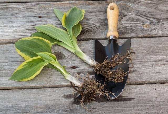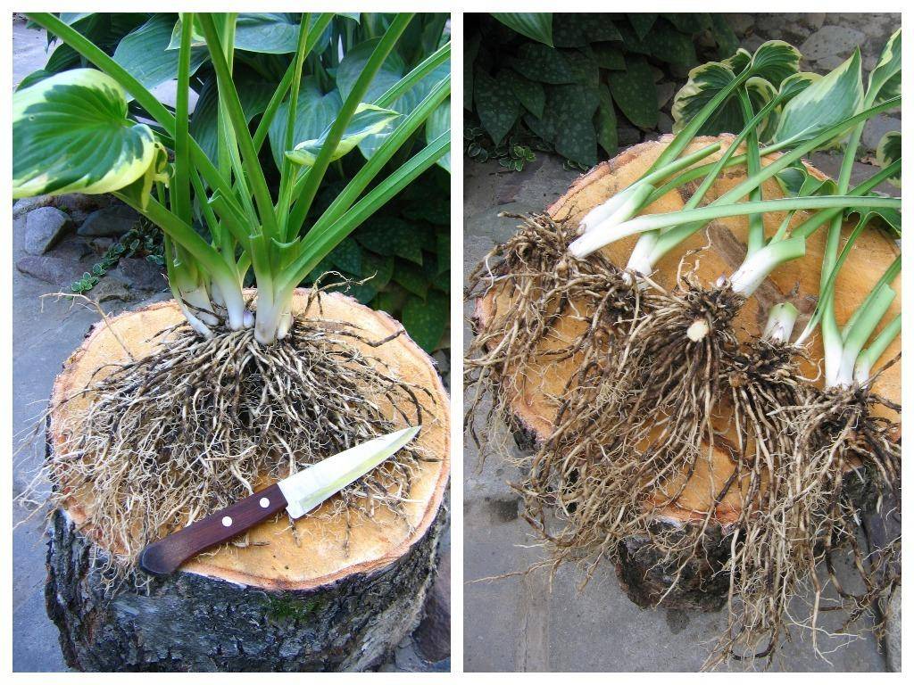 Για να διαιρέσετε έναν θάμνο, πρέπει να αφαιρεθεί από το έδαφος. Για να γίνει αυτό, το λουλούδι σκάβεται τριγύρω και αφαιρείται το φτυάρι. Είναι απαραίτητο να ελευθερώσετε τις ρίζες από το έδαφος. Για να γίνει αυτό, αρκεί να πάρετε το hosta με μια δέσμη και να αγγίξετε ελαφρά το κάτω μέρος του στο έδαφος. Εάν το έδαφος είναι απρόθυμο να φύγει, ξεπλένεται με νερό. Είναι σημαντικό οι ρίζες να είναι ορατές, τότε είναι πιο εύκολο να κατανοήσουμε πώς να διαιρέσουμε τον θάμνο με τη λιγότερη ζημιά για αυτό. Μετά από έλεγχο με μαχαίρι με σκελίδες, ο θάμνος αποσυναρμολογείται προσεκτικά σε τμήματα. Είναι καλύτερα εάν έχουν ένα ζευγάρι ροζέτες φύλλων σε κάθε ένα. Τέτοια όχι πολύ μικρά φυτά γίνονται γρηγορότερα αποδεκτά.