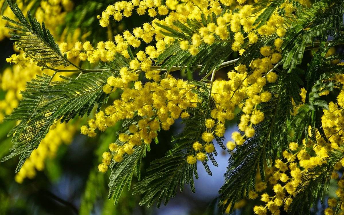 - τραχύ (lat.Mimosa Scabrella). Τα λουλούδια συλλέγονται σε καταπράσινους θαλάμους με έντονο κίτρινο χρώμα.