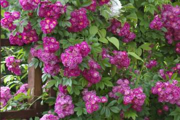 Η αναρρίχηση του τριαντάφυλλου Eric Taberly με μεγάλα και αρωματικά πορφυρά λουλούδια φαίνεται υπέροχη δίπλα σε ...