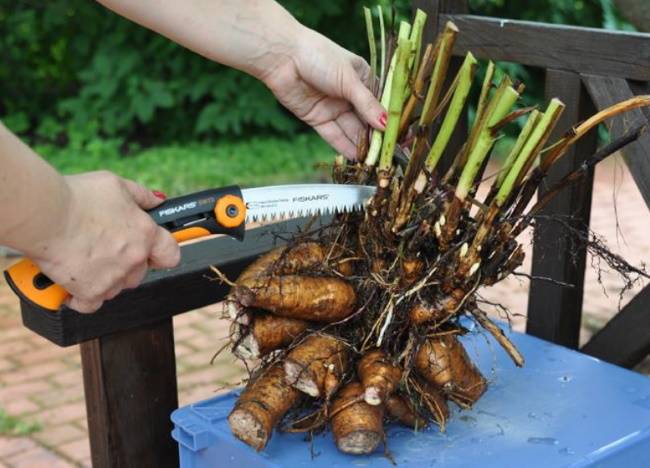 Σε έναν θάμνο που προορίζεται για μεταφύτευση ή για διαίρεση σε μοσχεύματα, όλοι οι μίσχοι συντομεύονται σε ύψος 10-15 εκ. Ο παιωνία θάμνος που εξάγεται από το έδαφος αφήνεται να στεγνώσει το έδαφος. Το αποξηραμένο χώμα αφαιρείται, το ρίζωμα κόβεται σε κομμάτια με ένα κοφτερό μαχαίρι κήπου. Κάθε ένας πρέπει να έχει τουλάχιστον 3 μπουμπούκια ανάπτυξης. Όλα τα μέρη των ριζών πρέπει να είναι υγιή, απαλλαγμένα από σήψη ή βλάβη από έντομα ή τρωκτικά.