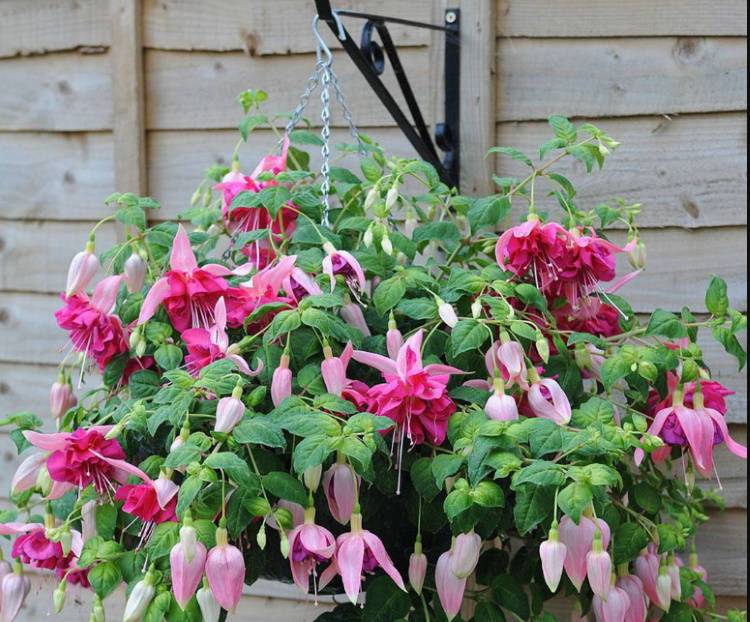 In order for ampelous fuchsias in a hanging pot to have a neat appearance and to bloom actively, they must be placed in a place protected from gusts of wind and direct rays of the sun. Many gardeners hang them on trees, in the shade of their branches, but at the same time they are very firmly attached to the trunks.
