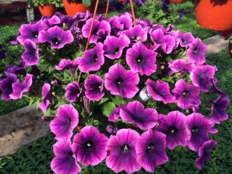 Petunia grows well in a hanging pot, blooms for several months. She is unpretentious in care. This is one of the most popular ampelous plants for pots on the street.