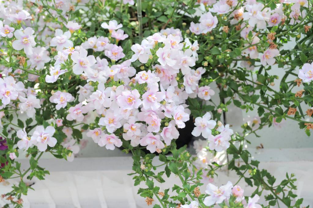 Long shoots reach 70 cm, small leaves are arranged in pairs, have an olive tint. Small flowers are densely placed on the bush, they are blue, white, pink and purple. Flowering occurs in waves.