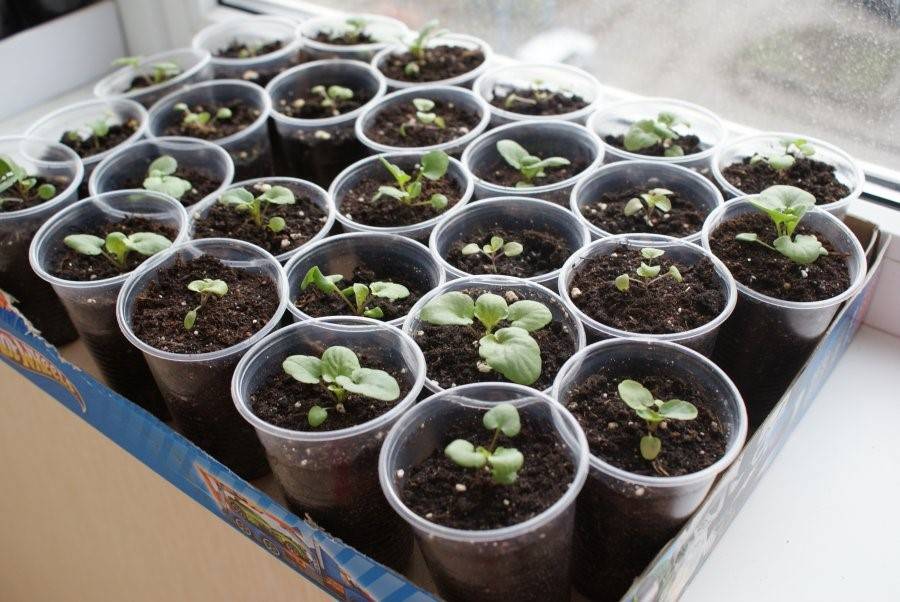 After the appearance of a couple of real leaves, the seedlings can be dived. You can plant each plant in individual cups or simply plant at a short distance in one large container. It is important to deepen the root well. Then the plant will be more resilient. After the appearance of three pairs of leaves, the crown of the seedling must be pinched. So the viola will start to bush.