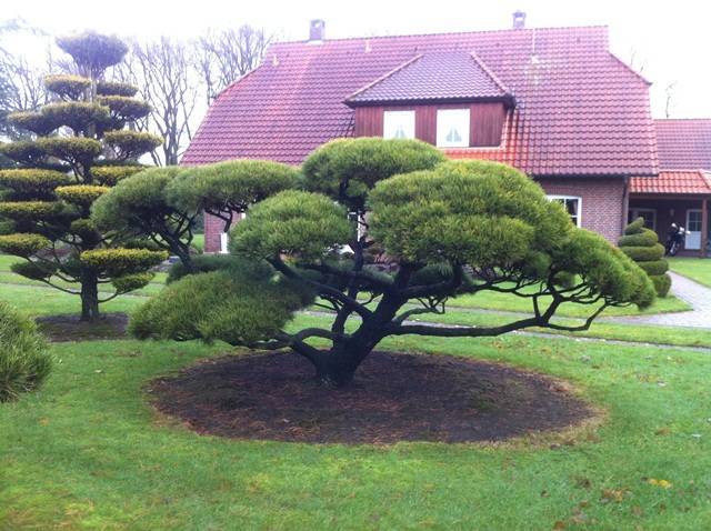 In essence, this is a technology for forming the crown of spruce, beech or maple. They are planted in tubs and cared for for many years, bringing the shape to the ideal.