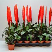 The rosette is formed in the form of a large glass. During flowering, inflorescences of a bright red hue are formed. The peduncle is not developed. Up to 12 inflorescences are formed. They are located on a short peduncle and may have a yellow tint.