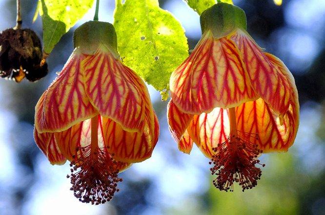 - megapotamskiy abutilon - domestic perennial maple with a straight high stem (1–2.5 m), green oval leaves and beautiful flowers with spots at the ends;