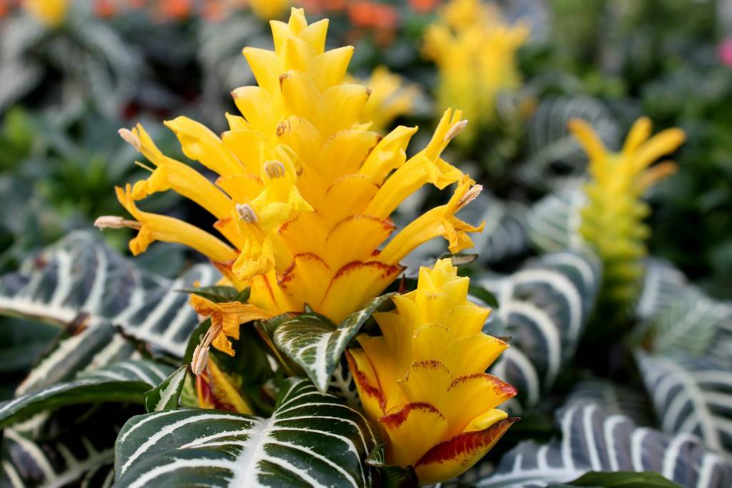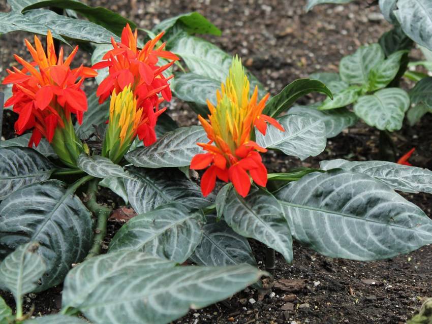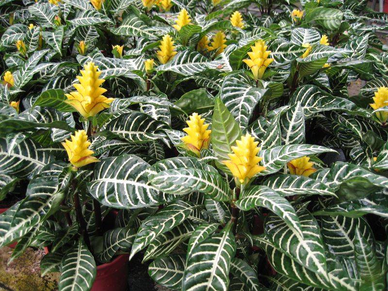 Afelandra has large green leaves. Some cultivars show pronounced white, silvery or cream veins. The decorative appearance of Afelandra is due to the spectacular bracts of yellow, orange or red. Their shape can be pineal or spike-shaped.