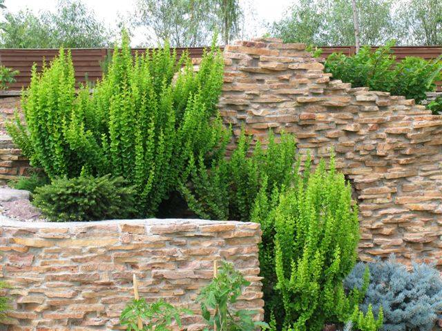 Barberry Erecta is best combined with low shrubs with different leaf colors. Also, the plant looks spectacular in flower beds and flower beds. But most often, from the many planted bushes, Erects form low hedges.