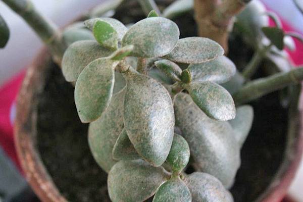 A symptom of crassula lesion with a spider mite is the presence of a white spider web on the leaves. The insect is red or gray in color, but it is very small, so it is quite difficult to detect it.