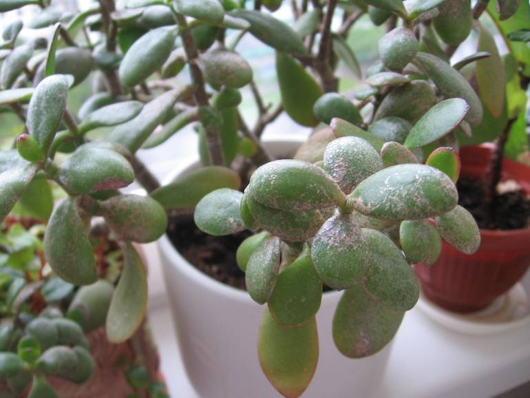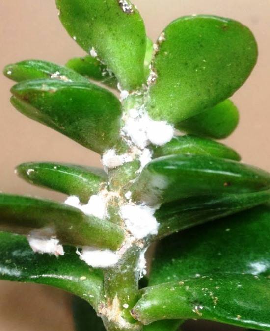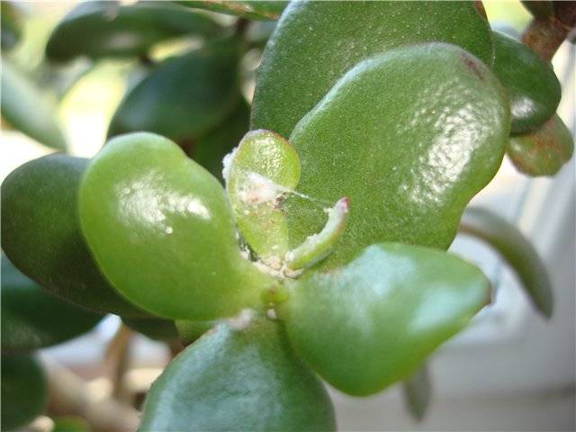 A sign of a mealybug affection of the fat woman is the formation of white spots, similar to cotton wool, on the leaves and other parts of the flower. The cause of the appearance of the pest is considered to be a strong waterlogging of the soil. Most often, the insect reproduces in high humidity and high room temperatures.