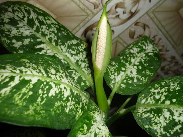 In indoor conditions, it is quite rare for a flower to bloom. And if you are lucky to see how Dieffenbachia blooms, then it will be a nondescript ear in the leaf sinus. Flowering lasts only a few days, then the flower begins to wither. Over time, a bright orange or red berry will appear in its place.