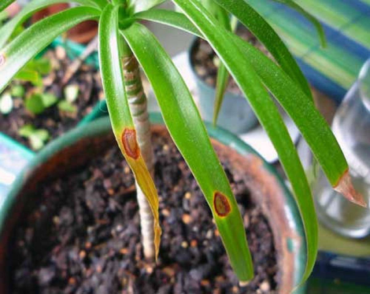 It happens that brown spots appear on the leaves of the dracaena. This can happen if the plant, while on the windowsill, is located in such a way that direct sunlight falls on the foliage. This means she could suffer from sunburn. On the surface of the sheet, first there are spots of a rusty tint, sticky to the touch. Then they dry out. As a result, the plant gets sick and eventually dies when ignored. You can save the dracaena by moving the pot to a shaded area and cutting off the infected leaves.