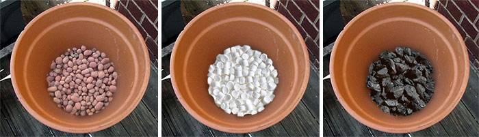 The layer of stones should be even, for the same distribution of water in the pot. After filling up all the layers of the pebble, the pot is shaken and knocked on it from the sides.