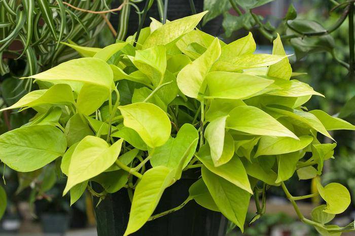 Epipremnum variety "Golden Potos" has a bright golden-green color of leaves and stems. An unusually fast growth of shoots is noted, which is ideal for vertical gardening.