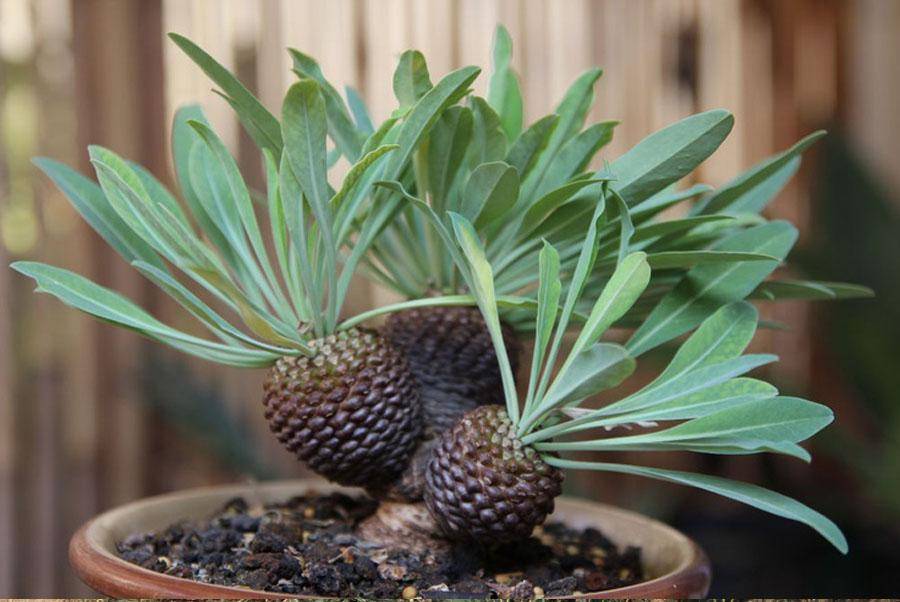 The plant is grown only in pots. The trunk of the euphorbia Gabizan reaches 30 cm and looks like a pineapple. At the top, green leaves grow, which are flat and rounded. With age, the trunk becomes brown and woody. Reproduction is possible by shoots or seeds.