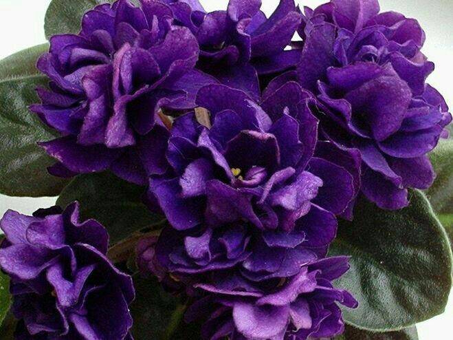 - deep purple flowers 6-7 cm in diameter. Inside there is a bunch of 4 yellow stamens. There are about 8 inflorescences in the socket. The variety blooms with a dense cap, which, despite the size of the flowers, does not disintegrate, but has a neat appearance. Inflorescences bloom for a long time, initially have a small size, gradually grow and become terry;