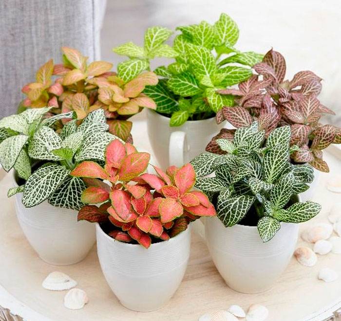 This houseplant is ornamental, belongs to the Acanthus family. Usually, a mini-flower bed of 5-6 varieties of Fittonia is formed in a pot. The leaves of the flower are its main decoration: they are quite long (up to 10 cm), oval, can be painted in shades of green, white, lilac and even red. The veins are also different in color, they are silvery, pink, dark greenish and white.