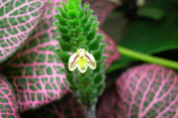 Fittonia is covered with single small flowers that have a yellow or cream color (even grayish is possible). They are grouped into spikelet-shaped inflorescences. Bracts are ovoid, their diameter is only 0.1 cm.