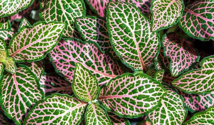 - miniature fittonia. It has small leaves that differ in all sorts of tones. The veins are so densely packed that they merge. This makes Fittonia leaves appear to be red, pink, or pale green.