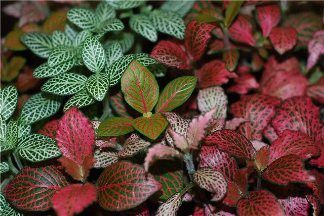 Also at home, Vershaffelt Fittonia is bred with olive leaves and a dense network of pink veins, they can be white or scarlet.