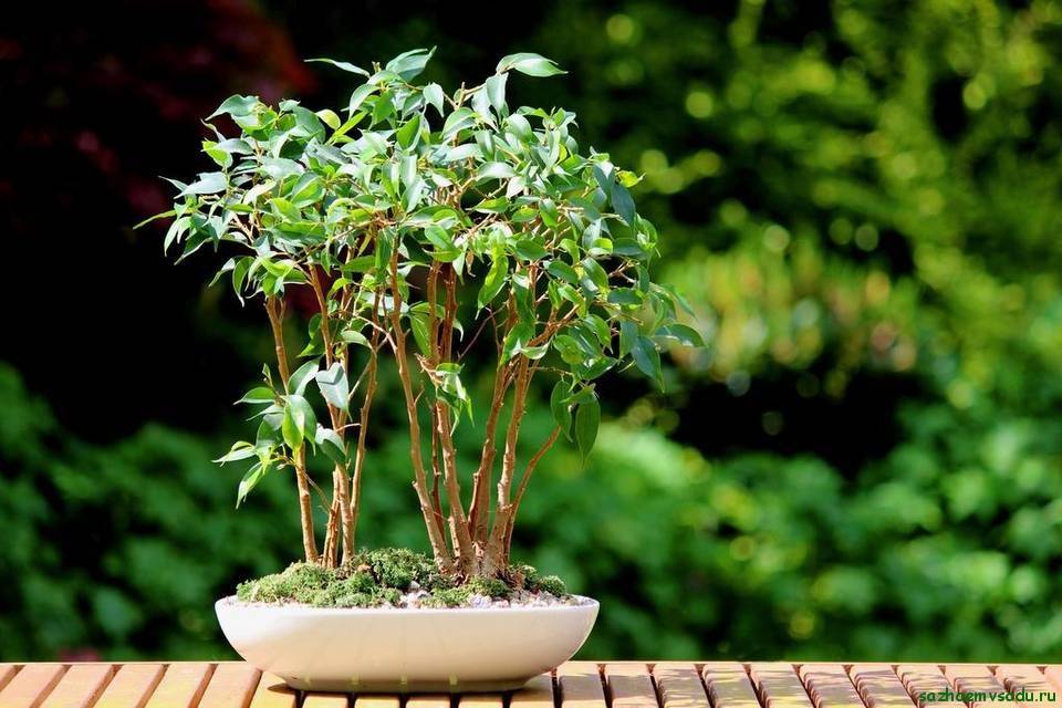 Bonsai are original plants that can be formed from any varieties of Benjamin ficus. But the most colorful plants come from the wyandy species. It grows rather slowly and has a trunk with wavy curvatures. This technology uses copper wire to wrap the shoots. Bending it, it turns out to give interesting shapes to the tree.