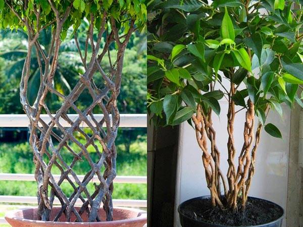 If you need to get the most effective tree, then you can try to use ficus weaving. True, it will take quite a long time, patience and skills. To implement it, it is necessary to plant several plants in one large tub at the same time. And then, with the help of certain clamps and possibly an insert, start weaving a frame from the trunks. After the branches are stiff, the ficus begins to hold the given shape.